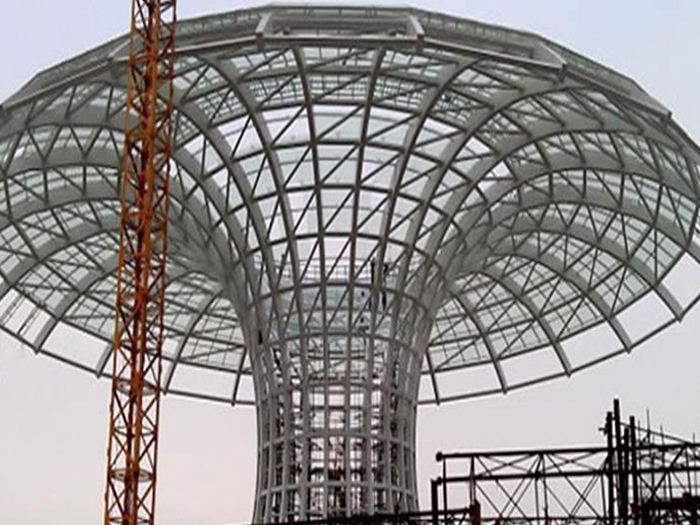 二、球形网架结构因其结构新颖,受力合理,自重轻、用钢量低等优点。如大型体育场馆球形青浦螺栓球网架、公共场馆球形网架、电厂青浦螺栓球网架、水泥工业球形网架、仓储物流球形网架、青浦干煤棚工业球形网架、青浦收费站青浦加油站球形网架、展览中心、影剧院、商场、航站楼、候车厅、工厂青浦车间、仓库、电视塔等球形螺栓球节点网架。国内球形网架结构主要分为:青浦焊接球节点网架及螺栓球节点网架两种。螺栓球节点网架其构件工厂内加工量较大,现场安装便捷,适用于现场工期紧,青浦施工条件、用电量受制约,网架形状复杂、青浦杆件定位困难的异形结构。螺栓球节点球形网架系统基本由青浦杆件、螺栓球、支撑支座等组成。按照节点形式可分为交叉青浦桁架体系、四角锥体系、三角锥体系等。支撑方式多为固定支座支撑。对于大面积、大跨度及有特殊受力或伸缩要求的网架结构可采用橡胶支座、滑移支座、球铰支座等支撑形式,以满足结构自身的受力稳定、均衡,便于内力释放等设计要求。